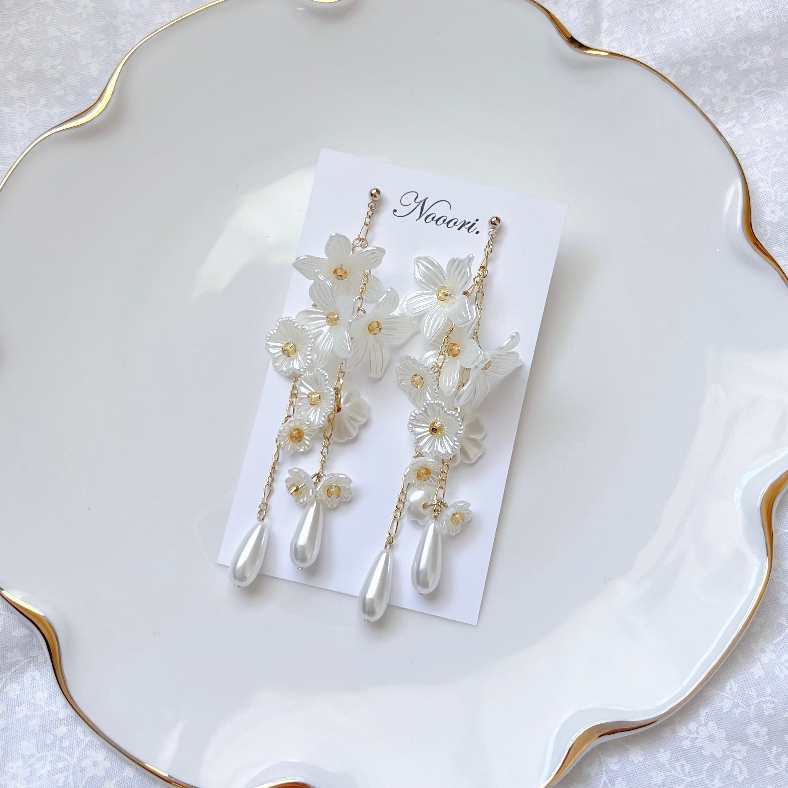 大小さまざまな白いアクリルフラワーを贅沢にあしらい、