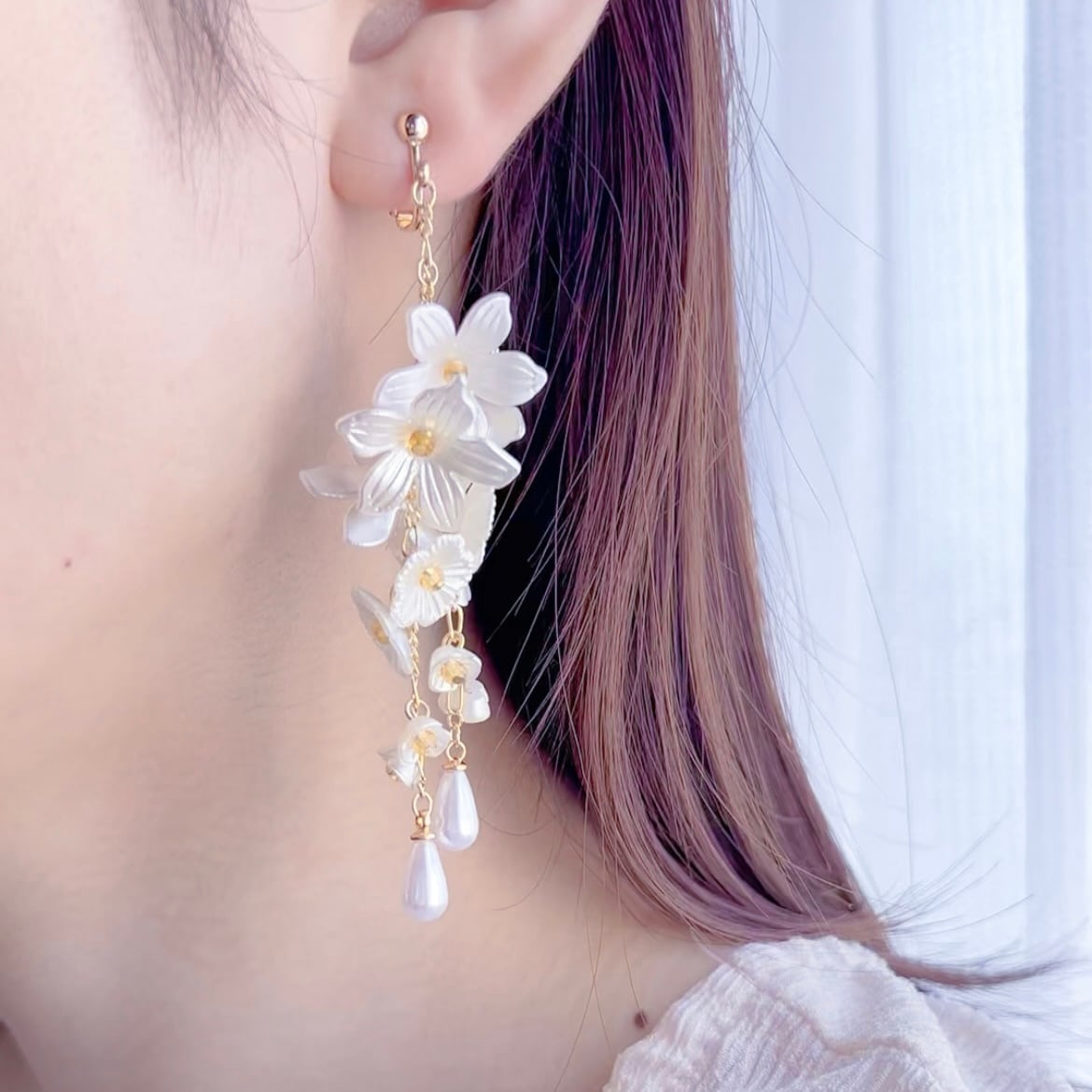 お花のシャワーのような華やかさを表現したイヤーアクセサリー。