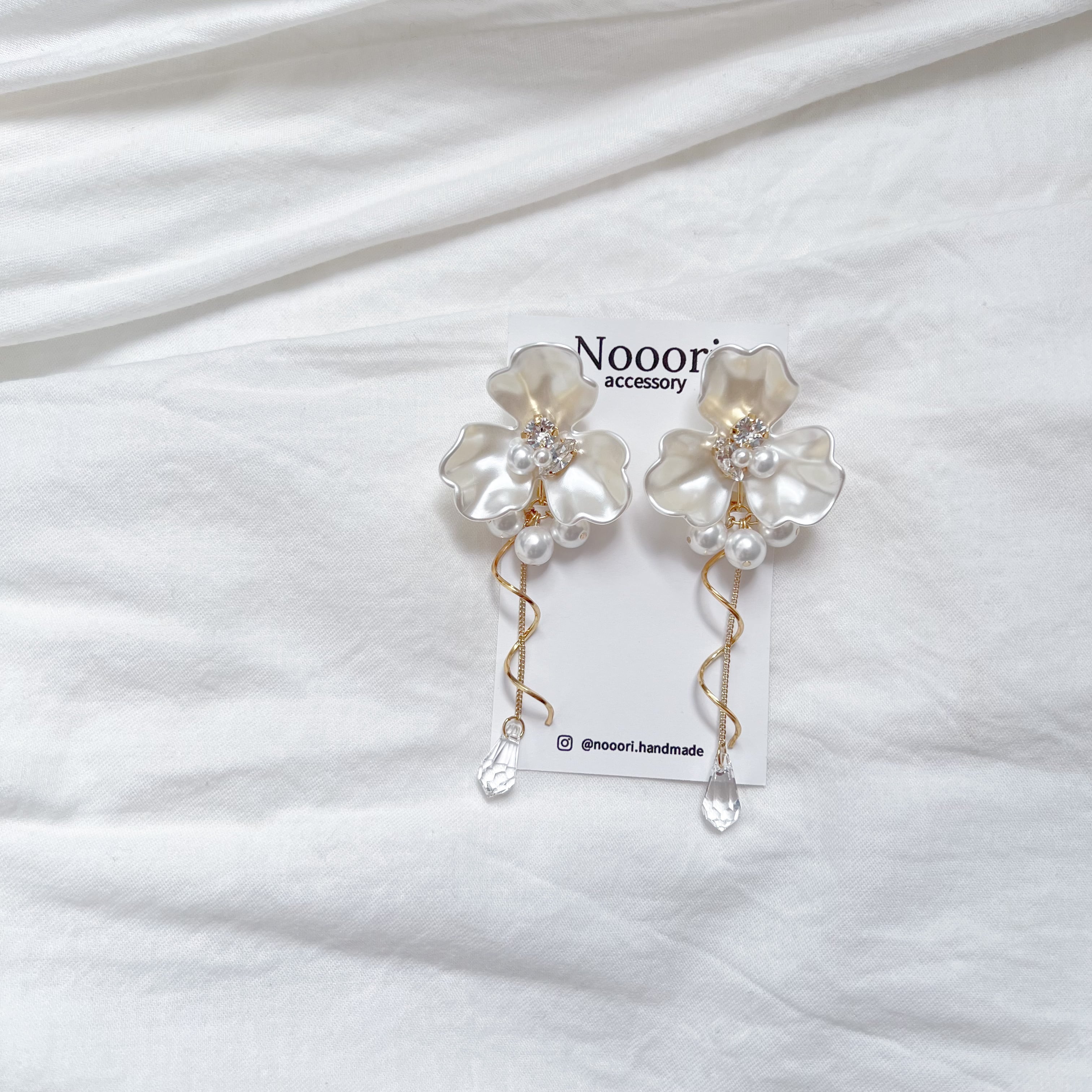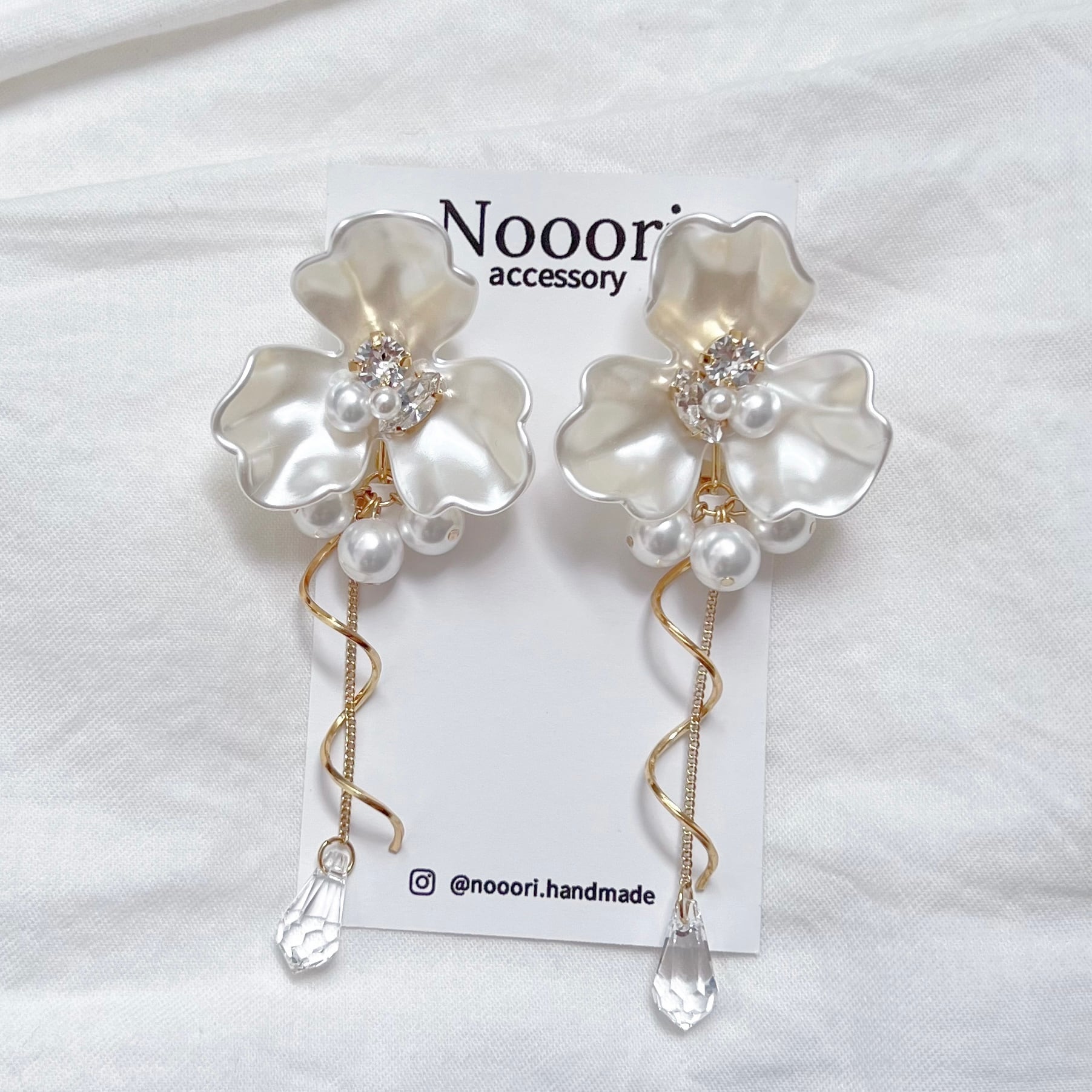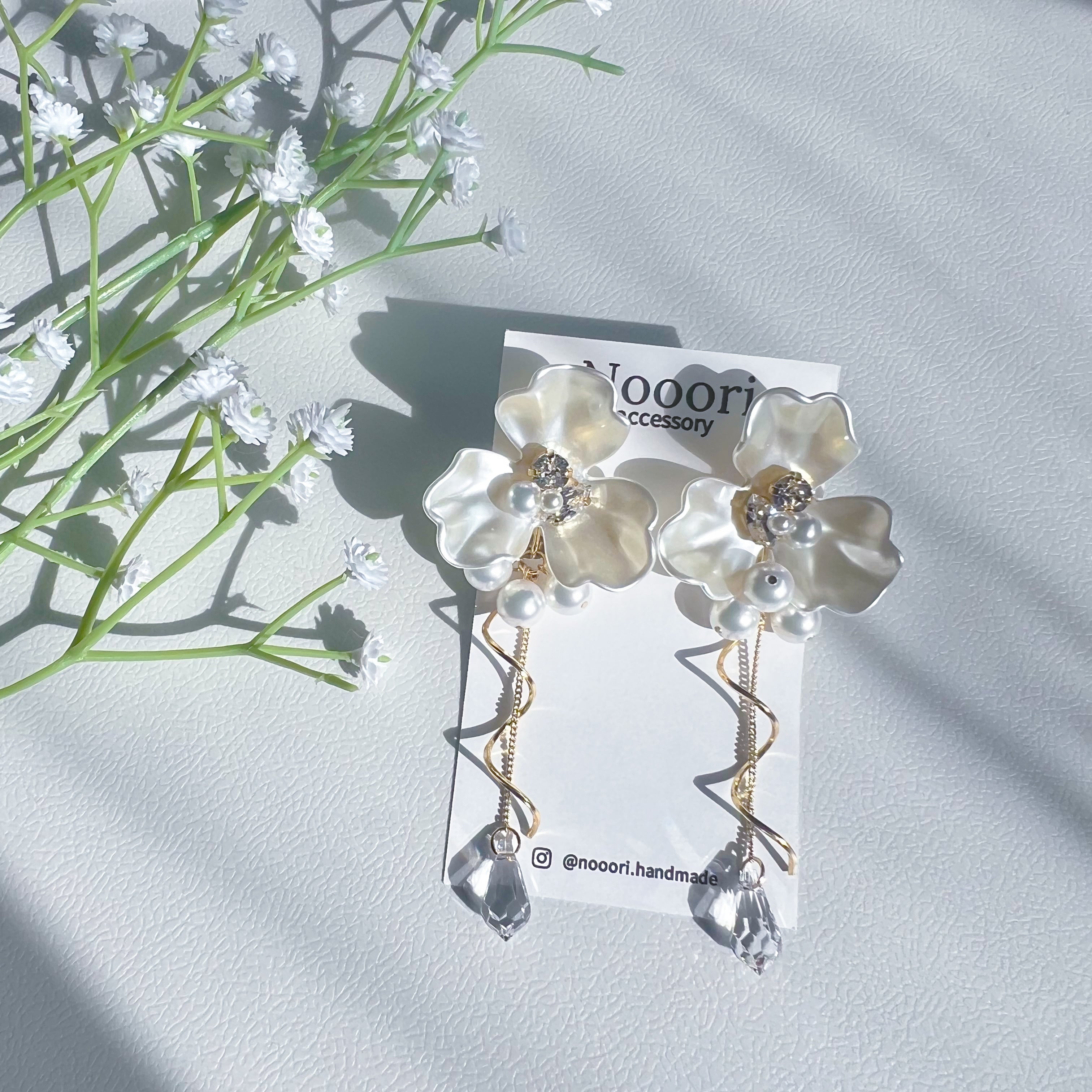 大ぶりフラワーの存在感が顔まわりを明るく引き立て、動くたびに揺れる雫型クリスタルが、視線を奪います。