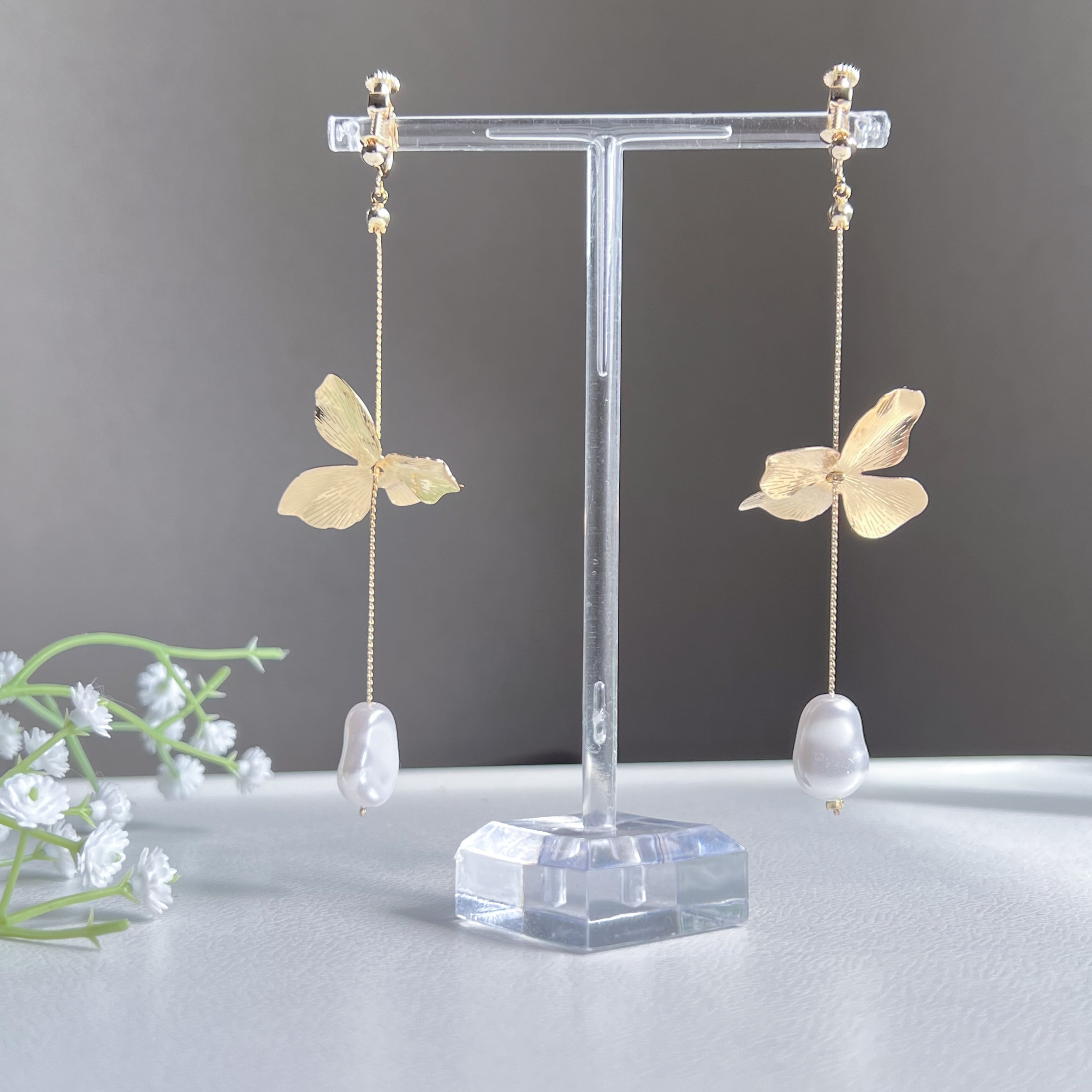 華奢なチェーンに大ぶりのメタルフラワー、そして優雅に揺れるバロックパールを添えた、上品で洗練されたイヤーアクセサリーです。
