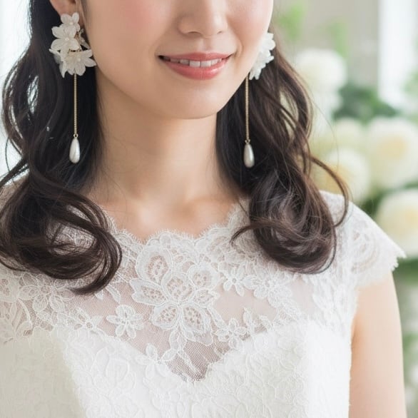 花びら一枚一枚に光を纏わせ、動くたびにしずく型パールがゆらりと揺れるたび、特別な一日をより美しく彩ります。